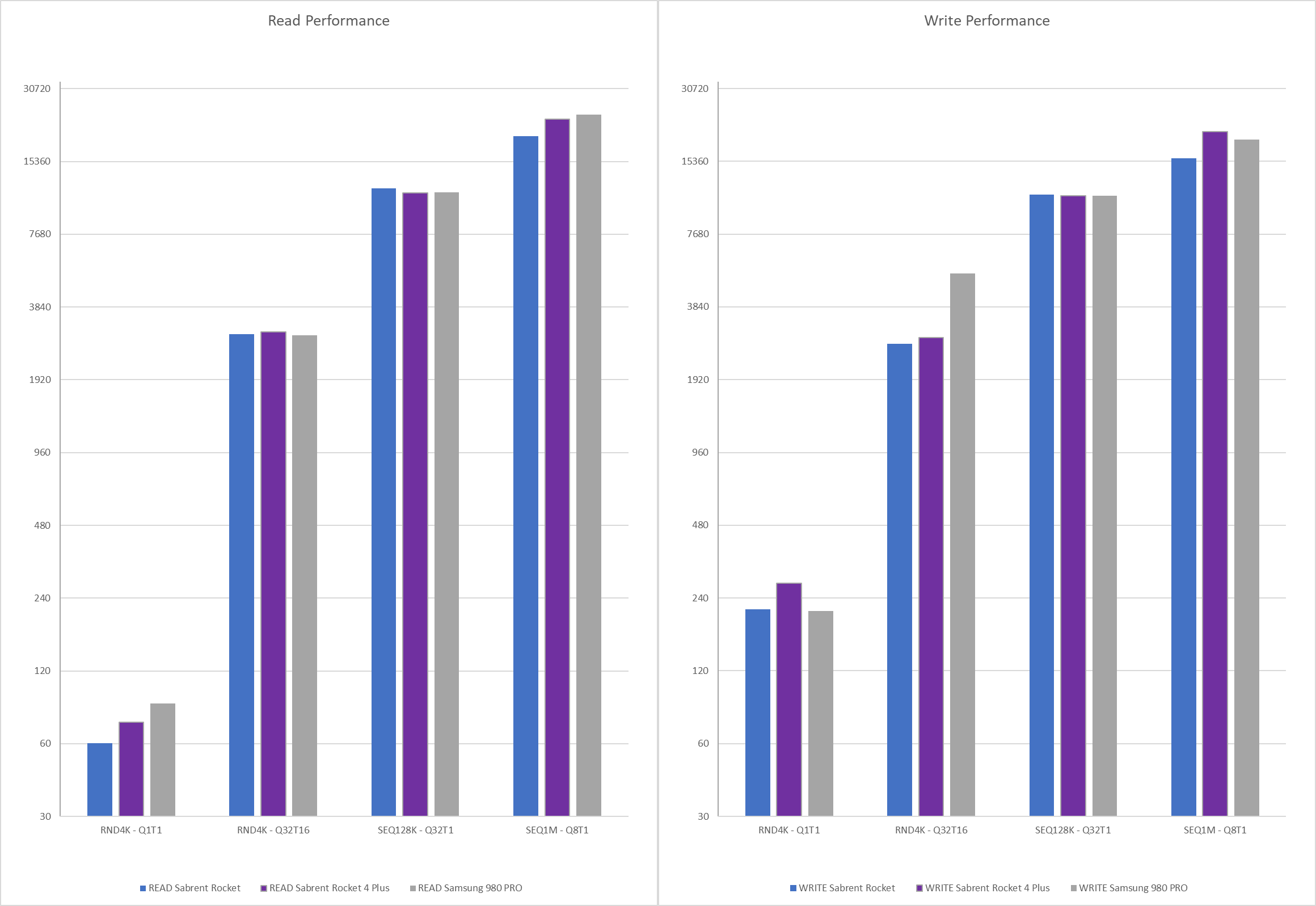 Looking at the results between the three different NVMe SSDs, there does not seem to be huge performance different between them. The 980 PRO keeps pace on the read side, coming ahead in the random 4KiB Q1T1 test, which is arguably the toughest test for a storage device. As well as the 1MiB sequential test. The Sabrent Rocket 4 Plus performs between in general with write operations, however there was a marked difference with the random 4KiB Q32T16, with the Samsung 980 PRO jumping ahead. This may well be due to Samsungs 1GB of LPDDR4 cache listed for the 980 PRO, providing a decent temporary storage space when getting hit from multiple sources. I am sure the Sabrent drives include a DRAM cache, but do not list any specifications for it.